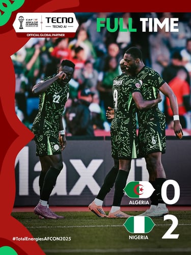 Samedi 10 janvier 2026 au Grand Stade de Marrakech. Dans un choc au sommet entre deux des meilleures attaques de la compétition, le Nigeria a dominé l'Algérie 2-0 pour se qualifier en demi-finales. Victor Osimhen et Moses Simon ont fait la différence face à des Fennecs dépassés physiquement et tactiquement. Le rêve algérien d'un troisième titre s'arrête en quarts. Les Super Eagles, eux, continuent leur marche triomphale.